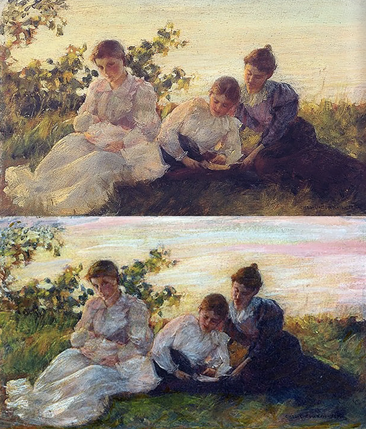 Mark Landis quickly made copies (bottom) of famous works like Charles Courtney Curran’s “Three Women” (top).